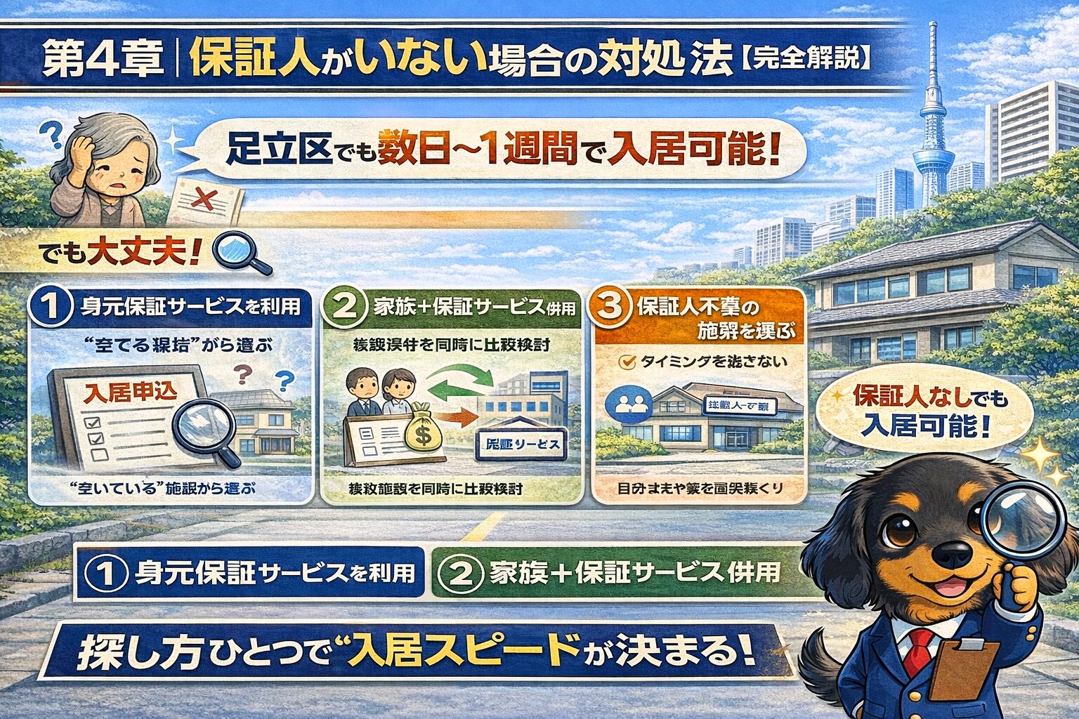 A. 多くの施設で必要ですが、身元保証サービスを利用すれば入居可能です。